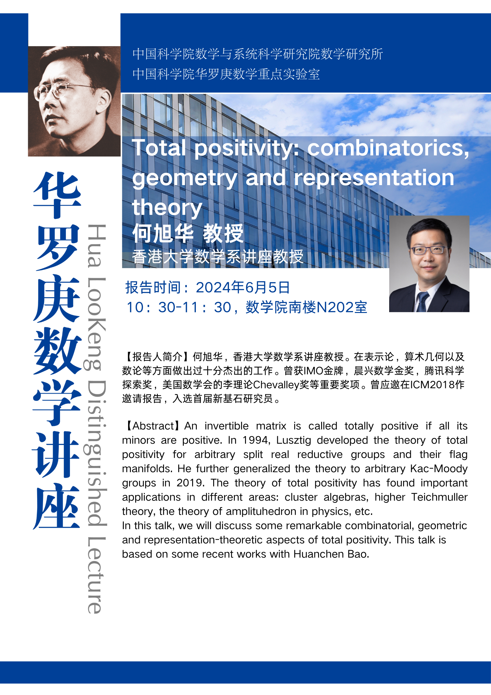 华罗庚数学讲座:Total positivity: combinatorics, geometry and representation theory