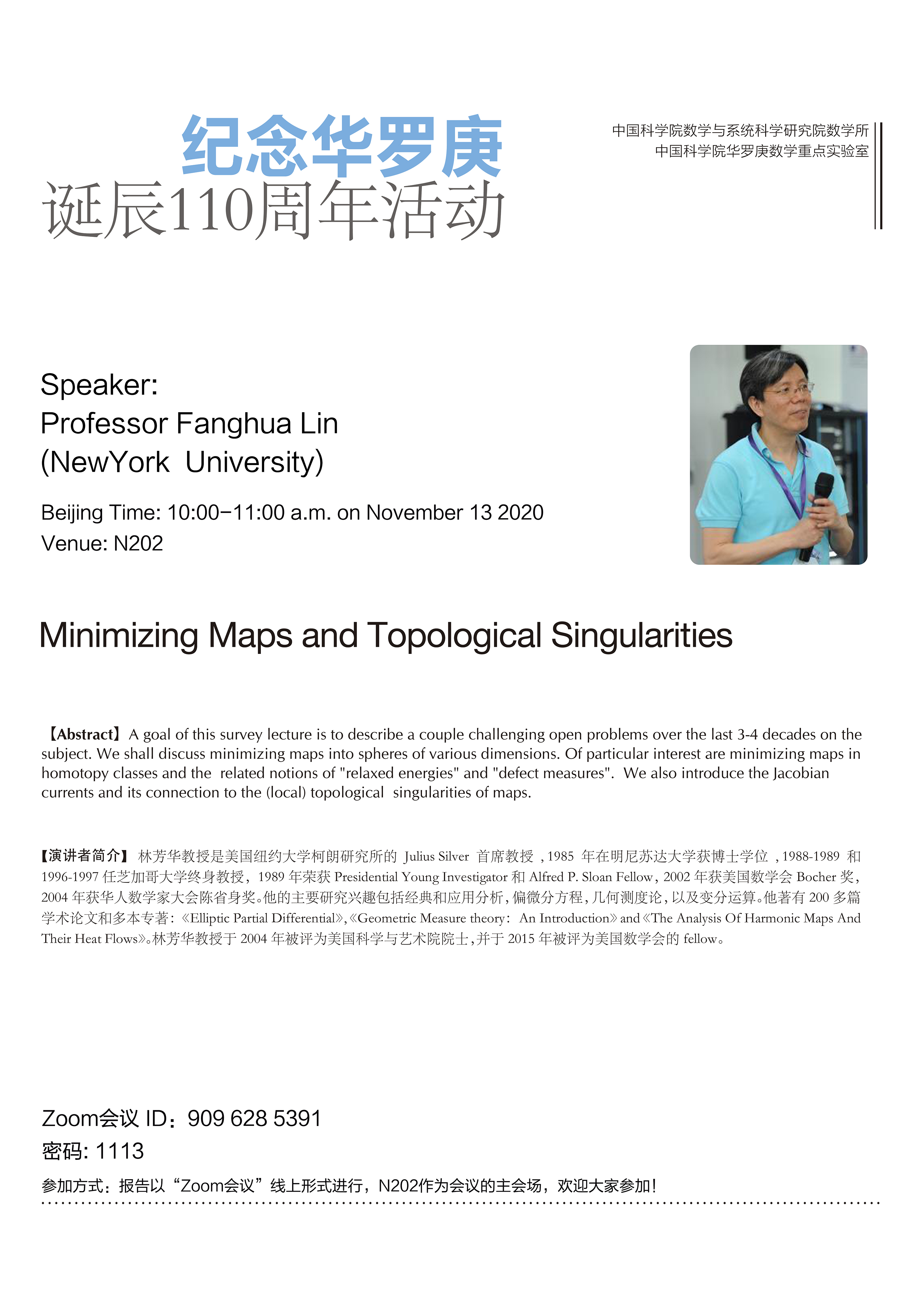 今年是华罗庚先生 (1910.11.12-1985.6.12)诞辰110周年。数学所举办“纪念华罗庚诞辰110周年活动”,以缅怀华先生献身科学事业的精神,活动日程如下: